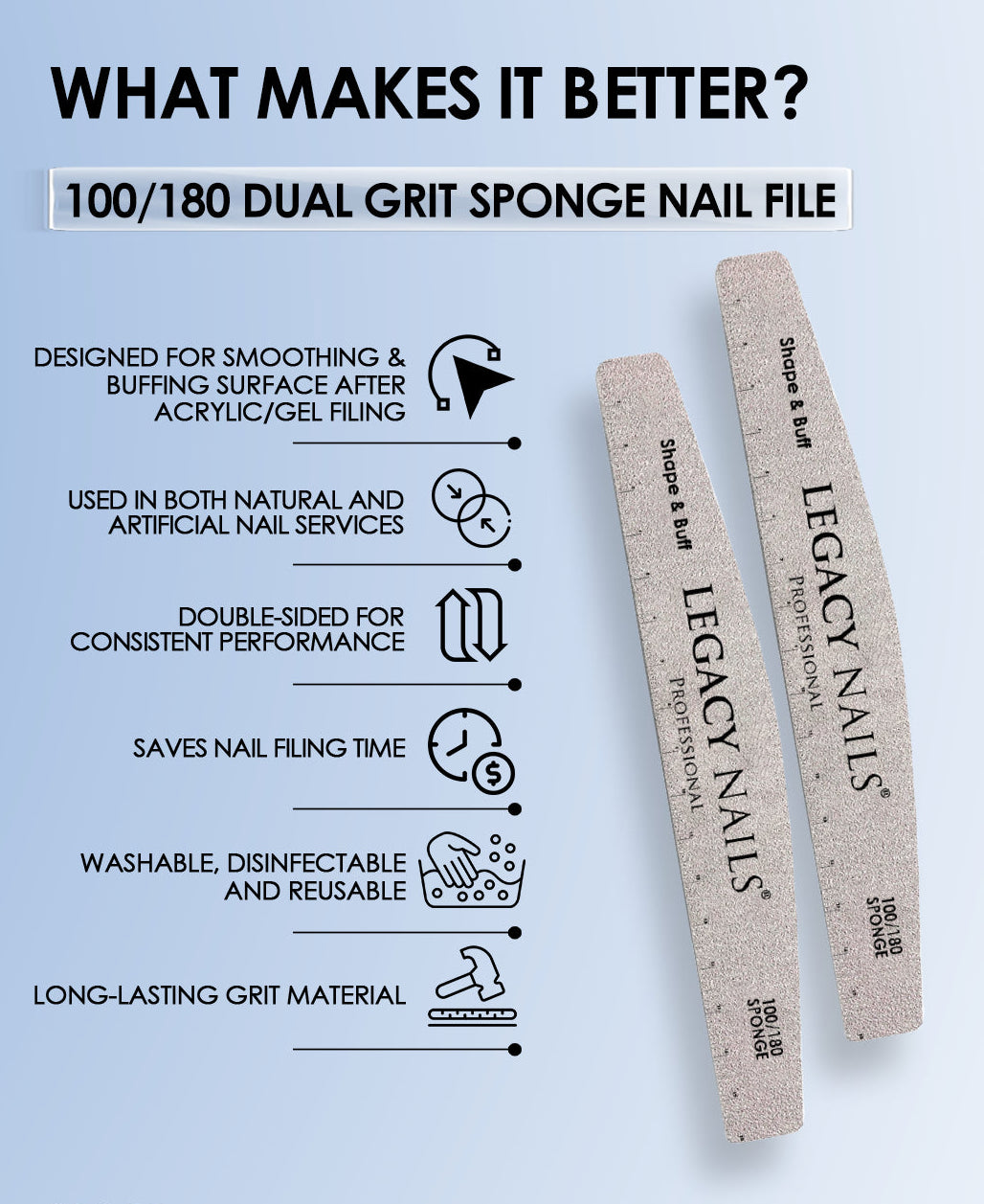 Dual Grit (100/180) – Perfect for smoothing & buffing acrylic or gel nails